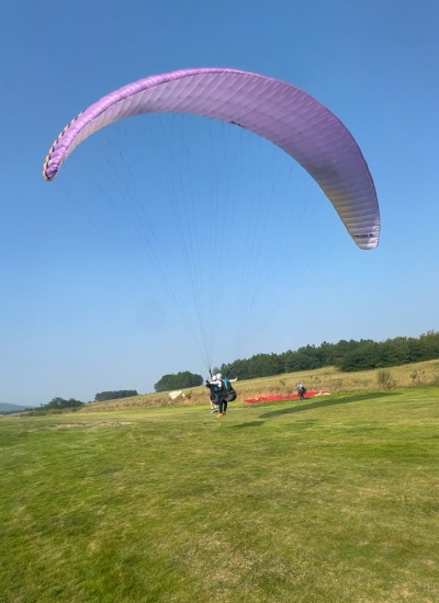 到達了飛行營地,教練將同學們分好組,隨后一組一組帶至草坪,先是做好安全防護:帶好頭盔,隨后穿好滑翔傘的裝備。細心的教練在起飛前給每個同學檢查好裝備,并講解如何助跑,如何借風,并要求落地時盡量屈膝站穩。掌握了這些要領,就可以開啟這場空中之旅了!