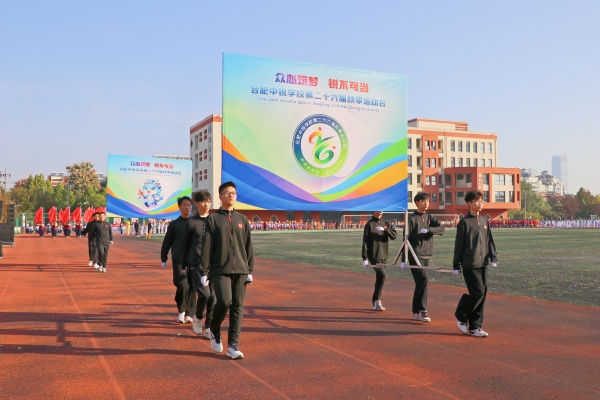 上午8時08分,在激昂的《運動員進行曲》中,開幕式正式拉開帷幕。首先步入會場的國旗方陣和會旗方陣,他們步伐鏗鏘,目光如炬。緊隨其后的是會徽吉祥物方陣、紅旗方陣、花環方陣、氣球方陣,他們走出了昂揚的姿態,展現出中銳學子蓬勃向上的青春活力。