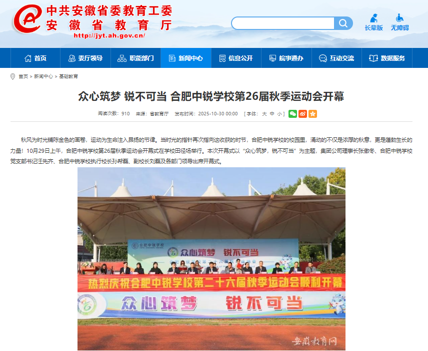 合肥中銳學(xué)校第26屆秋季運(yùn)動(dòng)會(huì)精彩開幕式獲安徽省教育廳官網(wǎng)專題報(bào)道