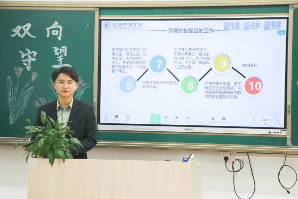 合肥中銳學校執行校長孫幫磊首先分析了當前高考改革新形勢與政策走向,幫助家長把握升學動態。隨后詳細闡述了我校的辦學目標——“辦有品質學校,做有溫度教育”,并介紹了我校精細化管理的具體措施,強調學校始終以學生成長成才為中心開展各項工作。
