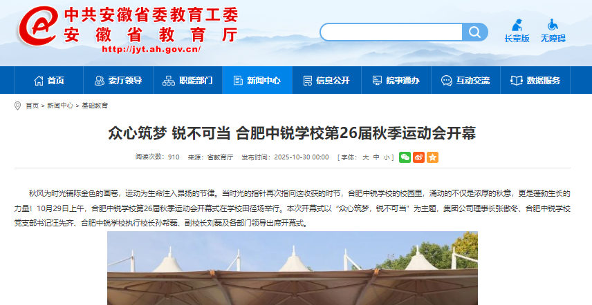 - 合肥中銳學校第26屆秋季運動會精彩開幕式獲安徽省教育廳官網專題報道